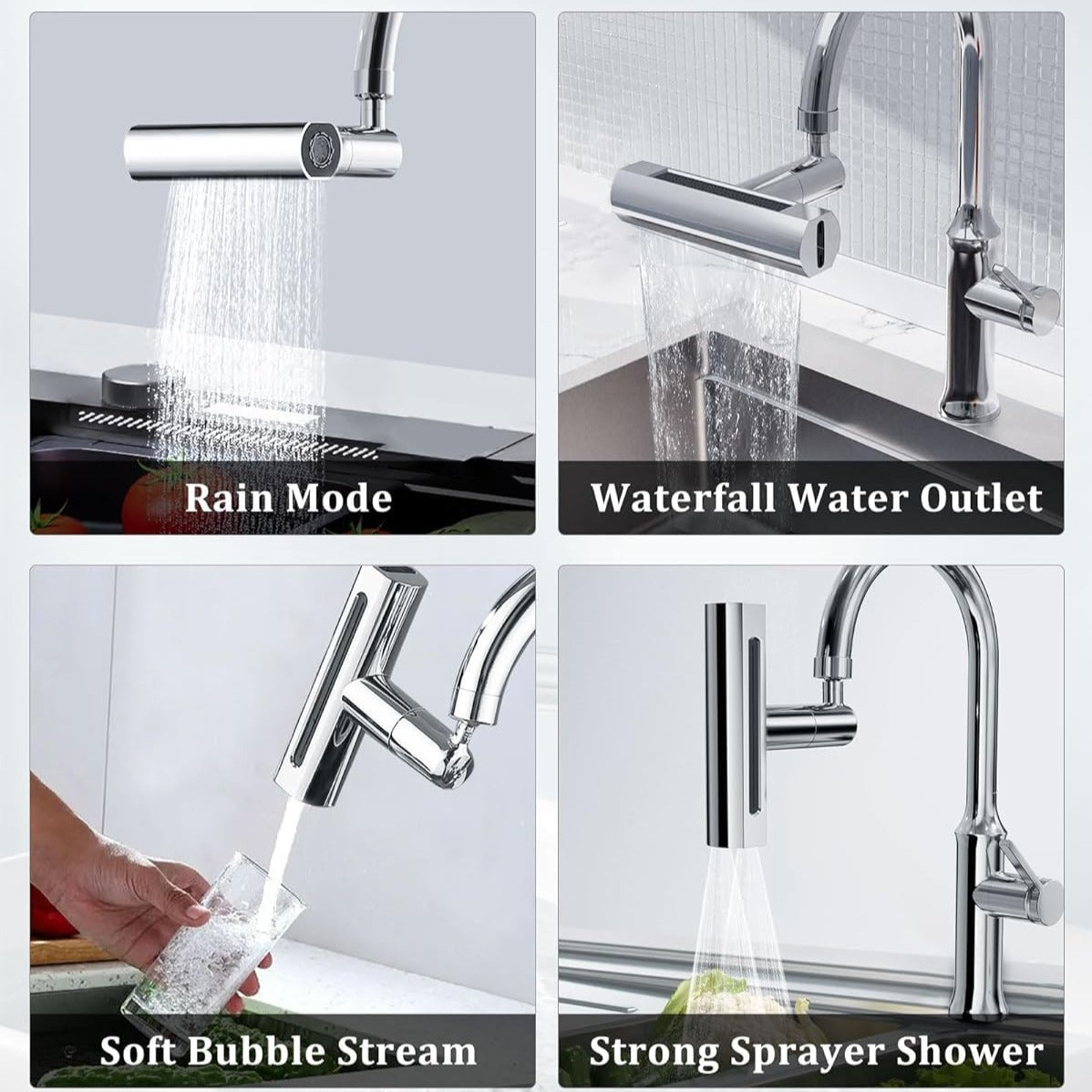 LEVEL UP YOUR KITCHEN! 4 Water Output Modes Waterfall spray mode, rain spray mode, bubble mode and double Aqua blade mode. Just switch the faucet, it can fully meet different needs of washing. Easy to Install Insert it into the aerator tap nozzle ABS + Brass Material The swivel head is made ...
