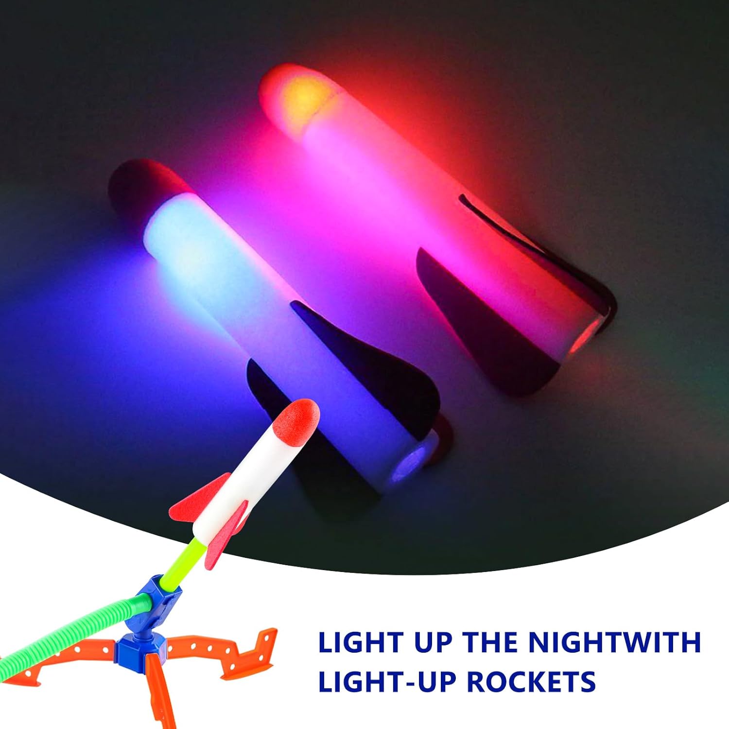 Rockets light up for extra fun, especially cool at night!