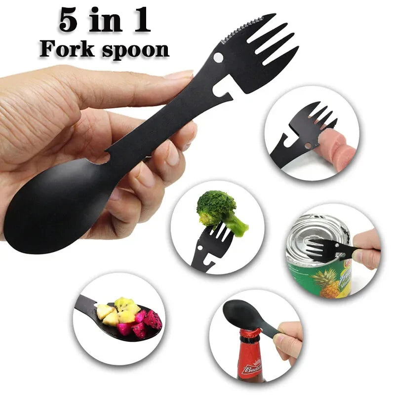 5-in-1 fork, spoon, can opener, bottle opener, serrated knife Easy to Carry and Clean 18cm long, 3.5cm width When you are involved in outdoor activities such as travel, camping, hiking and climbing, simply carry the camping fork spoon in your backpack or pouch. High Quality Material Made of stai...