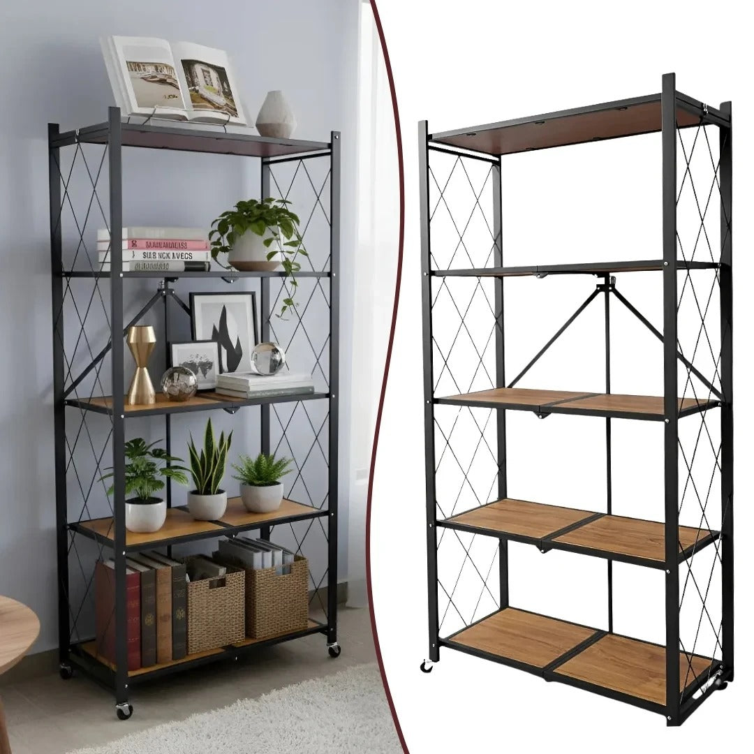 5-Tier Brown Foldable Storage Shelf with Wheels