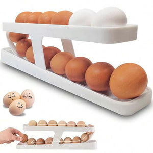 It's designed with 2 tiers that can hold up to 14 eggs, with a small footprint saves fridge space, and keeps eggs in order.